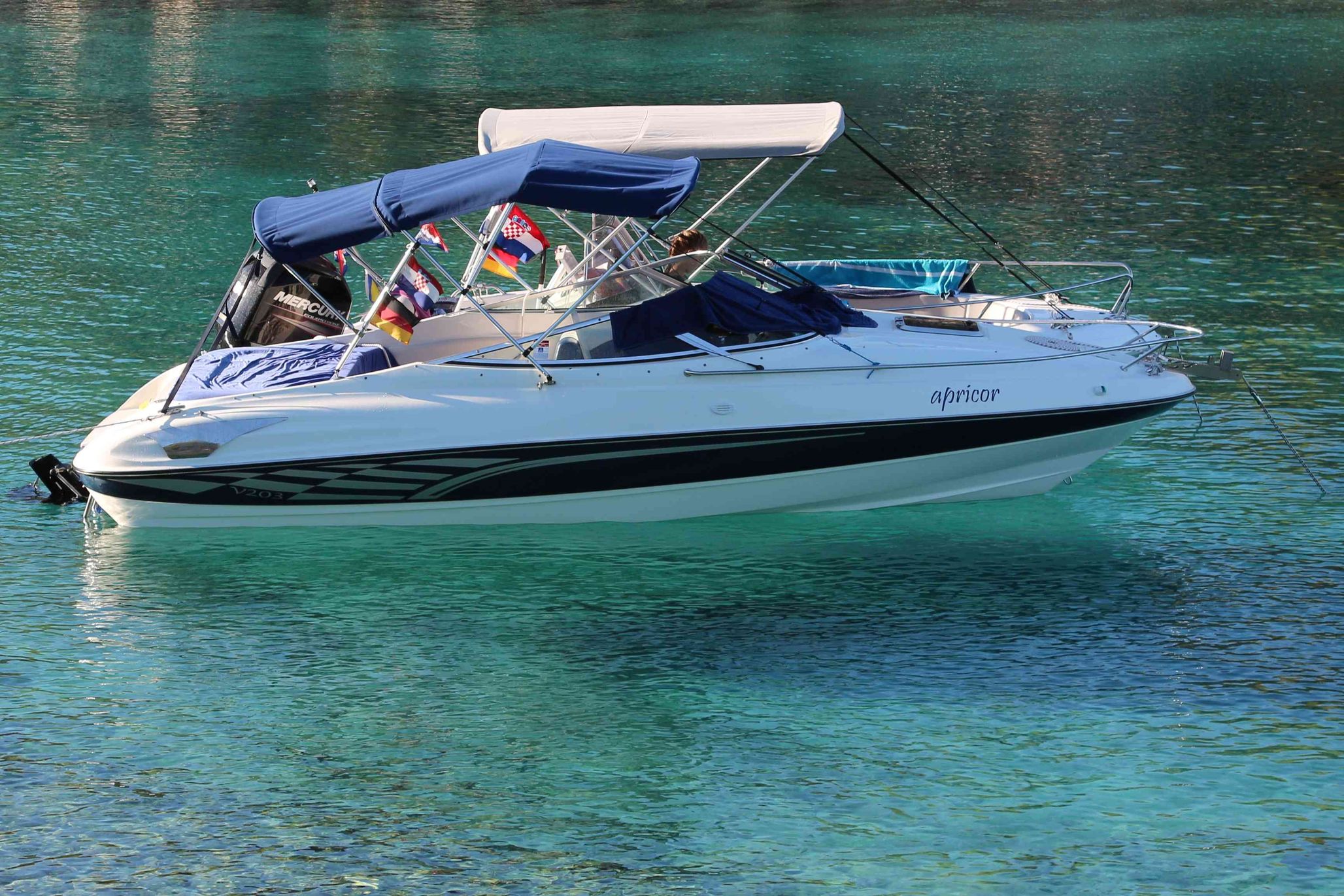 Empfehlen können wir die Firma getrago des Hr. Gitizad in Bonn der Seatech Biminis in Deutschland vertreibt. Nach einem Anruf wurde uns die passende Grösse empfohlen und eine Montageanleitung mit Bildern gesendet. Mittlerweile gibt es für Bayliner 2052 / Viper V203 auch komplette Camperverdecke dort. Das Gestänge haben wir später in Kroatien noch nach vorne und hinten verlängern lassen.